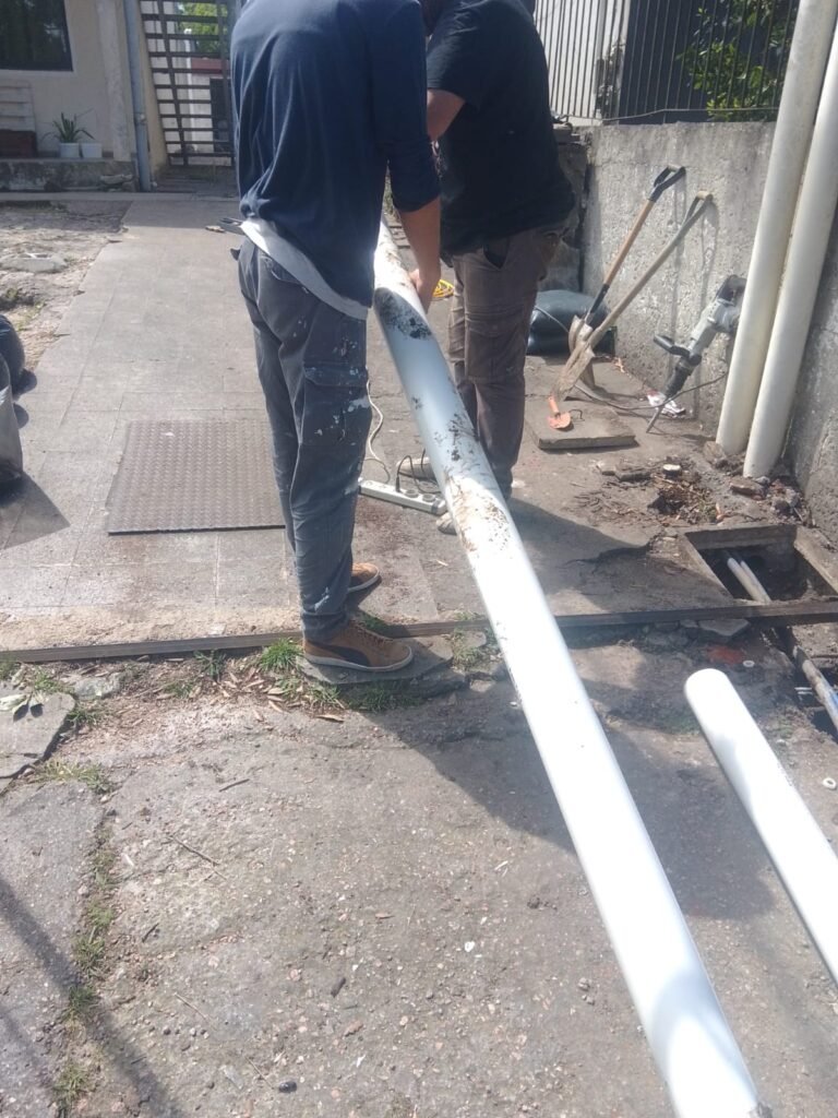 • Materiales de Calidad: Como muestra la foto, utilizamos cañerías de PVC de alta resistencia, el estándar moderno para desagües, que garantiza durabilidad y un flujo óptimo. Nuestros técnicos manipulan y preparan los nuevos tramos de cañería con precisión.